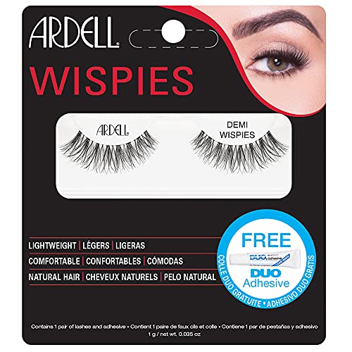 Product DescriptionArdell® Demi Wispies Black are full, fluttery and have a graduated mixed length. Slightly more curvaceous with flared outer corners for added definition. These lashes feature an invisible, lightweight band that connects the hair strands to form a strip that ensures secure corners.DirectionsGently flex the band so that it has a slight arch. Then align band with natural lash line to check the fit, and if necessary, trim the outer end with scissors. Apply a thin line of Ardell LashGrip Adhesive along band and wait for 30 seconds until adhesive becomes tacky. Place band against eyelid as close to the lash roots as possible. Gently press along the band out to the edges to secure. To remove: Starting from the outer edge, gently peel lash off lid. Carefully remove the adhesive from the band. To maintain shape for re-use: place lashes back on tray.Box Contains1 x Ardell Natural Style Lashes and Lash Adhesive