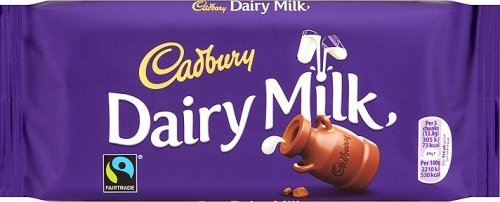Cadbury Dairy Milk Chocolate Bar (110g)IngredientsMilk**, Sugar, Cocoa Butter, Cocoa Mass, Vegetable Fats (Palm, Shea), Emulsifiers (E442, E476), Flavourings, **The equivalent of 426 ml of Fresh Liquid Milk in every 227 g of Milk Chocolate, Milk Solids 20 % minimum, actual 23 %, Cocoa Solids 20 % minimum, Contains Vegetable Fats in addition to Cocoa ButterLegal DisclaimerPlease be aware that unless expressly indicated otherwise, Cooking Marvellous are not the the manufacturer of this product. Product packaging may vary from what is shown on this listing. We recommend that you do not rely solely on the information presented on our listing. Please always read the labels, warning and directions provided before using or consuming the product.Manufacturer Contact InformationMondelez UK, PO Box 7008, Birmingham, B30 2PT. Mondelez Ireland, Malahide Road, Coolock, Dublin 5. Deliciously creamy milk chocolate made with a Glass and a Half of fresh milk. | Made with Fairtrade cocoa and sugar. | Generous 110g bar - perfect for sharing with friends and family. | Packed in our special easy-open, easy close wrapper.