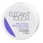 Elegant Touch Nail Polish Remover Pads (with different ingredients and packaging) Ingredients Propylene Carbonate, Isopropyl Alcohol, Alcohol Denat, Triethylhexanion, Tocopheryl Acetate, Parfum Directions Press and hold polish remover wipes on the nail for 5 seconds and remove nail polish untill nail is sqeak clean Safety Warning Keep Out of reach of children - Flammable