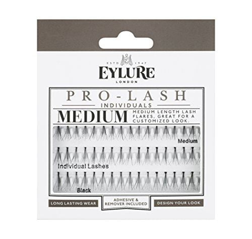 Eylure individual medium length lashes in black are semi-permanent, flared lash inserts that add fullness to your natural lashes. Use a few at the corner of the eye for a subtle look or as many as you dare for super-full lashes. Directions See pack for full usage instructions. Please read the instruction booklet supplied. Box Contains 51 x Medium individual lashes in black 1 x Superfix glue 1 ml 1 x Liftoff remover 3 ml 1 x Application and care leaflet Medium length artificial lashes | Add length and fullness to your natural lashes | Semi-permanent | Quick and easy to apply | Contact lens friendly