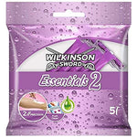 WILKINSON SWORD ESSENTIAL FEMALE 5 PACK Legal Disclaimer Wilkinson Sword Essentials 2 Disposable Razor offers you a close, smooth result with the convenience of a disposable. Twin blades and a lubricating strip with aloe. It has slim head to get into all those hard to reach areas and push clean bar to clear build up from between the blades. It has non slip, curved grip for easy handling. It is perfect for mini breaks, gym bags. It gives you smooth skin, without too much fuss or expense. Ideal for if you're on the move. It is suitable for women.
