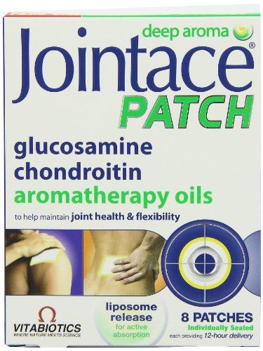 Jointace Deep Aromatherapy Patch helps provide fast, targeted support for joints and muscles for up to 12 hours. Its unique formula combines Aroma-ActiveTM essential oils with soluble Glucosamine and Chrondrotin for both short and long-term benefit. Each patch contains relaxing aromatherapy oils including Ginger, Eucalyptus, Clove, Lavender, Orange and Fennel, combined with the cooling effect of menthol. Glucosamine and Chondroitin, along with the essential oils are delivered through Jointace Patch?s novel Liposomal Release System. The patch can be easily applied to the elbows, knees, wrists, neck, back or shoulders. Jointace Deep Aroma Patch is non-greasy, non-sticky, non-staining and is suitable to wear under clothing. Indications Store at room temperature and away from direct sunlight. Always follow the directions. Ingredients Active ingredients: Glucosamine Sulphate, Chondroitin Sulphate. Aroma ActiveTM Essential Oils: Ginger Oil, Eucalyptus Oil, Sweet Orange Oil, Clove Oil, Lavender Oil, Fennel Oil, Menthol. Directions Jointace¬´Patch is suitable for use at any time of the day or night. The patch can easily be applied to the elbows, knees, wrists, neck, back or shoulders. 1. Dry skin before use. Cut open the foil sachet, remove the patch and peel off the protective film. 2. Stretch the patch slightly and apply the adhesive side to the desired area. 3. The patch can be worn for up to 12 hours after which time, discard and replace with a new patch as required. 4. Slightly bend joints such as knees and elbows if you apply a patch to these areas. If necessary an elasticated bandage or micro-pore tape can also help to secure the patch. Remove the patch before bathing or showering. Each patch is individually foil packaged to maintain its effectiveness. For maximum benefit the patch should be applied within one hour of opening the sachet. Each patch is for single use only. Store below 25 deg C in a dry place, out of sight and reach of children. Safety Warning For External Use Only. Not suitable for use during pregnancy. Do not apply to broken or irritated skin or near to eyes. Discontinue use if irritation or redness of skin develops. Not recommended for children under 10 years. Box Contains 8 patches Manufacturer Contact Information Vitabiotics Ltd, 1 Apsley Way, London, NW2 7HF. Jointace Deep Aroma Patch has been designed for direct application to the skin, with active absorption over 12 hours. | Combines six Aroma-Active essential oils plus cooling menthol with soluble Glucosamine Sulphate and Chondroitin | The nutrients in Jointace Patch are delivered via a deep acting liposomal release system facilitating their transfer through the skin. | Jointace Patch is ideally used alongside Jointace supplements to help offer extra support