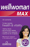 Vitabiotics Wellwoman Max - 84 Tablets/Capsules.IngredientsEach micronutrient tablet contains: L-Carnitine 30 mg, Alpha Lipoic Acid 20 mg, L-Methionine 40 mg, N-Acetyl Cysteine 30 mg, Green Tea Extract equiv. to 40 mg, Guarana Extract equiv. to 100 mg, Co-enzyme Q10 2 mg, Citrus Bioflavonoids 60% 10 mg, Natural Mixed Carotenoids 2 mg, Vitamin D (as D3 600 IU) 15 ?g, Vitamin E 20 mg ?-TE, Vitamin K 90 ?g, Vitamin C 80 mg, Thiamin (Vitamin B1) 10 mg, Riboflavin (Vitamin B2) 4 mg, Niacin (Vitamin B3) 36 mg NE, Vitamin B6 8 mg, Folic Acid 400 ?g, Vitamin B12 20 ?g, Biotin 50 ?g, Pantothenic Acid 6 mg, Magnesium 100 mg, Iron 14 mg, Zinc 15 mg, Copper 1000 ?g, Manganese 2 mg, Selenium 100 ?g, Chromium 50 ?g, Iodine 150 ?g. Each capsule contains: Omega-3 Fish Oil 400 mg, Providing: Omega-3 fatty acids 185mg, Starflower Oil 100 mg, Providing: Omega-6 fatty acids 17 mg, Evening Primrose Oil 100 mg, Providing: Omega-6 fatty acids 8.5 mg, Olive Oil (EP Grade) 60 mg, Providing: Omega-9 fatty acids 28 mg, Vitamin E 6.6 mg ?-TE. Each calcium & vitamin D tablet contains: Vitamin D (as D3 400 IU) 10 ?g, Calcium 500 mg.DirectionsONE MICRONUTRIENT TABLET (PURPLE BLISTER) PER DAY, PLUS ONE OMEGA 3-6-9 CAPSULE (GREEN BLISTER) PER DAY, PLUS ONE CALCIUM TABLET (BLUE BLISTER) PER DAY. Swallow each with water or a cold drink and take with a main meal. Not to be chewed. Do not exceed the recommended intake. To be taken on a full stomach. This comprehensive formula replaces other Wellwoman supplements & multivitamins. There is no need to take an additional multivitamin.Safety WarningFOOD SUPPLEMENT Food supplements must not replace a varied and balanced diet and a healthy lifestyle. As with other food supplements, consult your doctor or pharmacist before using if you are under medical supervision, pregnant, breast-feeding, have epilepsy, a thyroid condition, haemochromatosis, suffer from food allergies, or are allergic to any of the ingredients. Not suitable for children. As Wellwoman contains vitamin K, if you are taking anticoagulants (e.g. warfarin) do not take these tablets except on the advice of a doctor. Not to be taken on an empty stomach (see directions on back of box). This product contains iron, which if taken in excess, may be harmful to very young children.Box Contains84 Tablets/CapsulesManufacturer Contact InformationVitabiotics Ltd, 1 Apsley Way, London, NW2 7HF, England. Wellwoman Max provides maximum micronutrient support with a convenient 3-in-1 triple pack | 28x Wellwoman micronutrient vitamin and mineral tablets; 28x High purity Omega 3-6-9 capsules; 28x Calcium and vitamin D tablets | B vitamins: thiamine (vitamin B1), B6 and B12 which contribute to normal energy release | Zinc and iron contribute to normal cognitive function and vitamin D, folic acid and selenium contribute to the normal function of the immune system | The Omega-3 fish oil found in Wellwoman Max contains a rich source of DHA (Docosahexaenoic acid) and EPA (Eicosapentaenoic acid) essential fatty acids