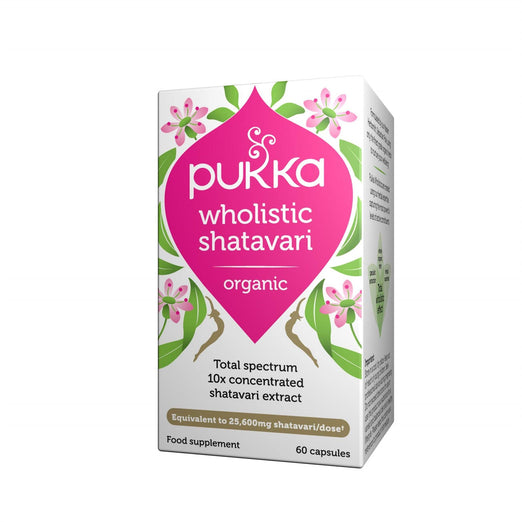 Shatavari has been used for thousands of years in India as a powerful female food supplement due to its superior qualities in supporting the female body. Shatavari thrives in dry arid soils where it has evolved an amazing ability to retain moisture. It is this quality that affirms a reputation for its uniquely soothing, moistening and nourishing properties. Shatavari is also a known adaptogen which enables it to maintain the perfect internal balance, helping you to stay radiant and brimming with vitality.Pukka’s Wholistic Shatavari uses a unique extraction process to retain all active compounds to ensure a powerful extract that is concentrated 10:1. Just two capsules is equivalent to 25,600mg of shatavariIngredientsShatavari root 65%, Shatavari root wholistic extract 30%, Nutrigest™ Seagreens Arctic fresh seaweed, Spirulina, Ginger root, Vegetable cellulose capsule (hydroxypropyl methyl cellulose).DirectionsTake 1-2 capsules a day with water or Pukka organic Aloe Vera Juice before food.Safety WarningKeep out of reach of young children. Seek professional advice during pregnancy. Do not exceed directions for use or use this product as a substitute for a varied and balance diet and a healthy lifestyle.Box Contains60 capsules
