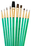 An assortment of hair types and durable handles in our range of Super Value Pack Brush Sets make these economical brush sets ideal for beginning artists and classroom use. Box Contains 10 piece set consists of, Sable/camel - flat 5/8. Detail rounds 3/0, 2/0, 0. Pointed rounds 1, 3, 5. Shaders 2, 6, 10.
