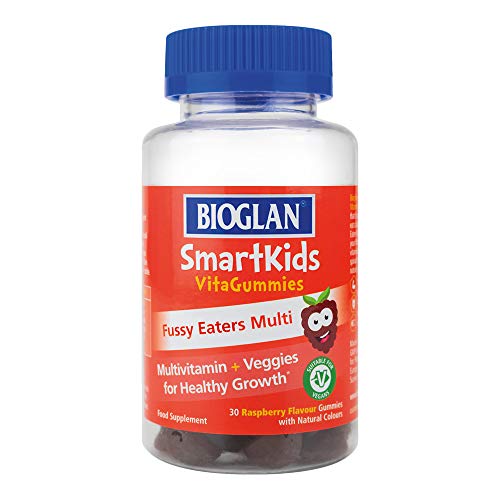 Bioglan Smartkids Fussy Eaters Multivitamin Gummies 30sAs parents we know that it can sometimes prove challenging to get our kids to eat a balanced diet rich in veggies! Bioglan Smart kids fussy eaters multi vitagummies is especially designed to support your little ones daily nutritional requirements. It combines key vitamins and iodine together with a 60mg veggie blend of spinach, broccoli & Carrot powder; giving your kids some of nature's goodness in a delicious raspberry flavoured gummy!.IngredientsMalt Syrup, Sugar, Glucose Syrup, Gelling Agent (Pectin), Vitamin C (Ascorbic Acid), Vitamin E (DL-Alpha-Tocopheryl Acetate), Acid (Citric Acid), Spinach Powder, Broccoli Powder, Carrot Powder, Acidity Regulator (Sodium Citrate), Raspberry Flavour, Vitamin A (Retinol Acetate), Natural Colour (Purple Carrot Juice Extract), Glazing Agents (Coconut Oil, Palm Oil, Carnauba Wax), Vitamin D2 (Ergocalciferol), Potassium Iodide. B07NW5VTMH
