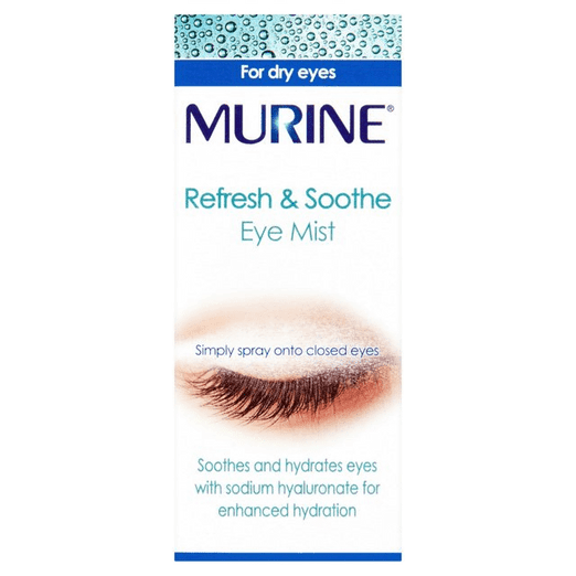 Murine Refresh and Soothe Eye Mist's unique formulation provides relief of dry and irritated eyes, without the need to apply eye drops. The fine mist is sprayed onto closed eyes and contains liposomes to replenish and stabilise the tear film layer and a lubricant to provide, long-lasting hydrating relief of dry and irritated eyes without flooding the eye or running down the face. The minimum fuss, odourless spray is convenient to use any time, any place and is ideal for those people who find conventional eye drops difficult to use. It can even be applied over waterproof make-up and is suitable for contact lens wearers. It is the ideal solution to help keep eyes looking and feeling their best.IngredientsIsotonic buffered solution containing Phospholipidic complex, Sodium Hyaluronate, EDTA, N-hydroxymethylglycinate, and PHMB.DirectionsSpray onto closed eye lids only. Hold the bottle 10cm from your eyes. Close eyes and press for a gentle, even mist. Spray 1 to 2 times on each closed eye. Blink occasionally for the best results. Can be used 3 to 4 times per day. Suitable for everyday use. Do not use at the same time as other eye care medicines. An interval of 10 to 15 minutes should be left between the use of different eye medicines. Store at room temperature. Can be used to end of the shelf life even once opened. Always read the label. The minimum fuss, odorless spray is convenient to use any time, any place and is ideal for those people who find conventional eye drops difficult to use. | It can even be applied over waterproof make-up and is suitable for contact lens wearers. | Murine refresh & soothe eye mist is the ideal solution to help keep eyes looking and feeling their best with a formulation which can be used up to the end of its shelf life once opened.