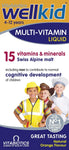 Expert nutritional support for kids Wellkid Multi-vitamin Liquid provides a comprehensive range of vitamins and minerals, plus malt extract which is specially formulated to help safeguard the nutritional intake of children aged 4-12 years. Comprehensive supplement for kids Wellkid Multi-vitamin Liquid has been produced with children's specific needs in mind to provide a comprehensive range of 15 nutrients, plus Swiss Alpine malt to help safeguard your child's nutritional intake. It comes in a great tasting natural orange flavour that kids will love. The challenges of healthy eating Growth is especially rapid during the first 12 years of a child's life. Continuous development of bones, muscles, blood and the brain mean that children have a high nutrient requirement compared to their body size. Meeting those nutritional requirements can be a challenge, as it is common for children to be fussy eaters. You may experience your child refusing to eat certain foods, disliking certain tastes or textures, or being reluctant to try new foods. Children usually grow out of fussy eating and in the meantime nutritional supplements such as Wellkid Multi-vitamin Liquid can help safeguard a child's nutritional intake as part of a balanced diet. Government surveys have indicated that children's diets can be low in certain nutrients such as iron, which contributes to normal cognitive development of children. This is especially true for vegetarians, as iron from non-meat sources may not be as easily absorbed by the body. Wellkid Multi-vitamin Liquid is formulated with moderate levels of iron and is suitable for vegetarians. Support for rapid development Wellkid Multi-vitamin Liquid is formulated with iodine which contributes to normal growth in children, plus vitamin D which helps maintain normal growth and development of bone in children. The UK Department of Health recommends young children aged up to 5 years take a daily supplement containing vitamin D. The vitamin D in Wellkid Multi-vitamin Liquid is included in the preferred vitamin D3 form (cholecalciferol) that is naturally produced by the skin when exposed to direct sunlight. Calcium is an essential mineral, also needed for normal growth and development of bone in children. However, it has not been included in the Wellkid Multi-vitamin Liquid formula, as it is not possible to include a meaningful amount in the multi-vitamin formula. For mothers particularly concerned about the normal bone health of their children we recommend Wellkid Calcium Liquid, which contains calcium and vitamin D and can be taken alongside Wellkid Multi-vitamin Liquid.IngredientsPurified Water, Raw Cane Sugar, Malt Extract (from Barley), Glucose Liquid (Sulphur Dioxide), Ferric Ammonium Citrate, Zinc Sulphate, Vitamin C (Ascorbic Acid), Stabiliser: Xanthan Gum, Preservative: Potassium Sorbate, Natural Flavouring (Orange Ext.), Niacin (as Nicotinamide), Vitamin E (DL-Alpha Tocopheryl Acetate), Acidity Regulators: Citric Acid & Sodium Hydroxide, Pantothenic Acid (D-Panthenol), Vitamin B2 (Riboflavin 5-Phosphate Sodium), Thiamin (Vitamin B1 as Hydrochloride), Vitamin B6 (Pyridoxine HCI), Copper Sulphate, Vitamin A (as Palmitate [Antioxidant: DL-Alpha Tocopherol]), Folic Acid (as Pteroylmonoglutamic Acid), Potassium Iodide, Vitamin D3 (Cholecalciferol), Vitamin B12 (Cyanocobalamin)DirectionsDirections Shake well before use. Give to your child orally, as below. 4 to 10 years: 1 teaspoon (5ml) daily 11 to 12 years: 2 teaspoons (10ml) daily 1 teaspoonful = approx. 5ml Recommended with or following a meal. Not to be taken on an empty stomach. Do not exceed the recommended intake. Some natural change in colour may occur after opening. Measuring spoon included (recyclable plastic). Wash and dry the spoon thoroughly after use (not in a steam steriliser).Safety WarningDo not use if the bottle seal is broken on purchase. Food supplements must not replace a varied and balanced diet and a hea Wellkid Multi-vitamin Liquid formula is based on the very latest scientific research, with nutrient levels carefully optimised with children's specific needs in mind. | Wellkid Multi-vitamin Liquid is produced to high GMP (Good Manufacturing Practice) standards of quality control. | Wellkid Multi-vitamin Liquid is free from artificial sweeteners, colours and flavours | Wellkid Multi-vitamin Liquid has not been tested on animals.