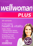 Wellwoman Supports Wellbeing of Women, for more information please visit their website: www.wellbeingofwomen.org.uk facebook.com/Vitabiotics Twitter@Vitabiotics Join us for the latest health conversations and special updates on Facebook & TwitterIngredientsBulking Agents: Dibasic Calcium Phosphate & Pregelatinised Starch, Magnesium Oxide, Polyvinylpolypyrrolidone, Potato Starch, Vitamin C (Ascorbic Acid [Carrier: Glyceryl Tristearate]), Vitamin E (D-Alpha Tocopheryl Acid Succinate) (from Soya), Ferrous Fumarate, Zinc Sulphate, Niacin (Nicotinamide), Para Amino Benzoic Acid, Polyvinylpyrrolidone, Anti-Caking agents: Stearic Acid, Silicon Dioxide, Magnesium Stearate & Purified Talc, Tablet Coating (Hydroxypropylmethylcellulose, Propylene Glycol, Ethylcellulose, Polydextrose, Fractionated Coconut Oil, Natural Source Colours: Titanium Dioxide, Copper Chlorophyllin), Vitamin B12 (Cyanocobalamin [Carrier: Dicalcium Phosphate]), Citrus Bioflavonoids (Carrier: Maltodextrin), Thiamin (Vitamin B1 as Mononitrate), Vitamin B6 (Pyridoxine HCl), Natural Mixed Carotenoids (Betacarotene Crystalline [Gamma-carotene, Citroxanthin, Beta-zeacarotene] Antioxidant: DL-Alpha Tocopherol Acetate, Carriers: Potato Starch), Pantothenic Acid (as Calcium Salt), Riboflavin, Manganese Sulphate, Copper Sulphate, Vitamin D3 (Cholecalciferol [Medium Chain Triglycerides, Colloidal Silica, Talc, Maltodextrin, BHA & Ethylcellulose]), Vitamin K1 (Phytomenadione [Carriers: Acacia Gum, Glucose Syrup, Tricalcium Phosphate]), Folic Acid (as Pteroylmonoglutamic Acid), Sodium Selenate, Chromium Trichloride, Biotin.DirectionsOne tablet per day (purple blister) and One capsule per day (aqua blister). Micronutrient formula to help maintain health & vitality With vitamins D, B12 and zinc which contribute to normal function of the immune system The Queen's Awards for Enterprise Innovation 2013 - Queen's award for enterprise innovation in vitamin research UK's No 1 for women Quality guaranteed Gluten free No artificial colours No preservatives, salt or yeast Wellwoman Plus is not tested on animals Britain's No.1 supplements