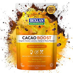 Bioglan Superfoods - Cacao Boost 70gWe have chosen Superfoods Cacao, Lucuma, Maca and Hemp for their energy-enhancing properties in this unique organic blend. Lucuma (a fruit native to the Andean valleys of Peru) and Maca (a root vegetable also native to the Andes) give the blend a delicious malty, caramel flavour. These blend perfectly with the richness of Cacao and the nuttiness of Hemp, which is also a source of protein.IngredientsOrganic Cacao Powder (35%), Organic Lucuma Powder (30%), Organic Hemp Protein Powder (22%), Organic Maca Powder (13%).DirectionsGive your smoothie a boost by adding 1-2 tsps. Or for an energising hot drink, mix to a paste with some hot water and top up with hot milk, sweeten with honey to taste. Supercharge your breakfast bowl by swirling 1-2 tsps of Cacao Boost into your porridge, yoghurt or sprinkle over granola or muesli. Simply swap our Cacao Boost powder for cocoa powder in muffins, brownies and cupcakes. B07TLVYH74