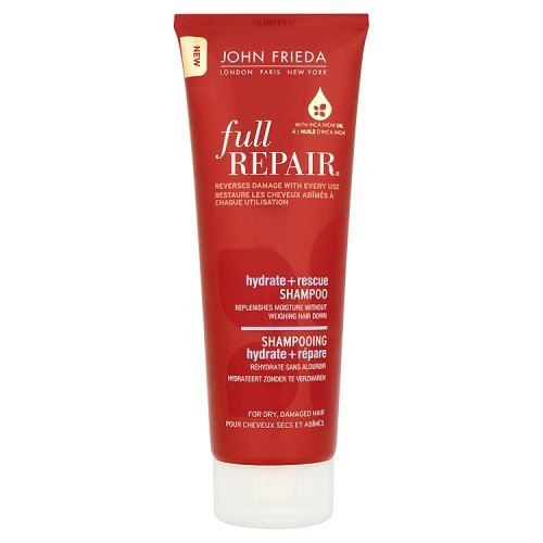 John Frieda Full Repair Hydrate & Rescue Shampoo 250ml reverses the look and feel of damage with every use. Hydrating formula, with Inca Inchi Oil rich in omega-3, rescues hair from the look and feel of damage as it nourishes strands with lightweight moisture to restore softness and shine. Ingredients Aqua, Sodium Laureth Sulfate, Sodium Lauryl Sulfate, Cocamidopropyl Betaine, Glycol Distearate, Cetyl Alcohol, Parfum, Cocamide MEA, Sodium Chloride, Silicone Quaternium-18, Guar Hydroxypropyltrimonium Chloride, Benzyl Alcohol, Trideceth-6, Disodium EDTA, Malic Acid, Trideceth-12, Glycine, Plukenetia Volubilis Seed Oil, PPG-9, Stearoxypropyl Dimethylamine, C14-28 Isoalkyl Acid, Sodium Hydroxide, C14-28 Alkyl Acid, Methylchloroisothiazolinone, Stearyl Alcohol, Methylisothiazolinone, Tocopherol, Hexyl Cinnamal, Limonene, Linalool, Citronellol Directions Apply shampoo to wet hair, lather, rinse well. Follow with Full Repair Hydrate + Rescue Conditioner. Safety Warning For external use only.Avoid direct contact with eyes. In case of eye contact, rinse immediately with water. Cosmetic use only. Store below 30 degrees Celsius. Box Contains 1 x John Frieda Full Repair Hydrate & Rescue Shampoo 250ml Manufacturer Contact Information Kao (UK) Limited, London, EC1A 2DY. Reverses damage with every use | For dry, damaged hair | Hydrating formula, with Inca Inchi Oil rich in omega-3 | Lightweight moisture | 250ml bottle