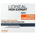 Hydra energetic daily moisturiser L'Oreal Men Expert Hydra Energetic Daily Moisturiser Pot delivers 24 hours hydration and helps protect from dryness. Suitable for normal, dry or sensitive skin. Constantly attacked by external aggressions, skin can become dry, tight and feel uncomfortable. Men's skin is thicker and need tailor-made care. Action 1 Hydrates intensively for 24 hours. This formula brings to skin intensive hydration for 24 hours and helps reduce dryness. Result: Skin feels suppler, nourished with moisture and comfortable all day long. Action 2 Protects from daily aggressions Enriched with a protective complex, the formula helps skin fight daily external aggressions such as wind, pollution and cold. Specifically engineered for men, this fresh formula is quickly absorbed for a non-sticky and non-greasy feel on skin. ADS - Active Defence System A powerful soothing ingredient which helps reinforce skin's defence against daily aggressions.IngredientsAqua / Water, Butyrospermum Parkii Butter / Shea Butter, Glycerin, Dicaprylyl Ether, Aluminum Starch Octenylsuccinate, PEG-40 Stearate, Cetyl Alcohol, Glyceryl Stearate, Panax Ginseng Extract / Panax Ginseng Root Extract, Sorbitan Tristearate, Camellia Sinensis Extract / Camellia Sinensis Leaf Extract, Sodium Hydroxide, Ammonium Polyacryldimethyltauramide / Ammonium Polyacryloyldimethyl Taurate, Propylene Glycol, Caprylyl Glycol, Menthol, Acrylates / C10-30 Alkyl Acrylate Crosspolymer, Pentaerythrityl Tetra-Di-T-Butyl Hydroxyhydrocinnamate, Methyl Paraben, Phenoxyethanol, Linalool, Limonene, Parfum / Fragrance, Please check back of pack for up to date ingredientsDirectionsHow to Use? Apply daily all over the face. After shaving, it soothes the sensation of razor burn.Safety WarningKeep out of the reach of children.Manufacturer Contact InformationL'Oreal Paris, London, W6 8AZ. Comes with hydraprotect complex