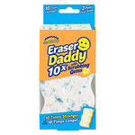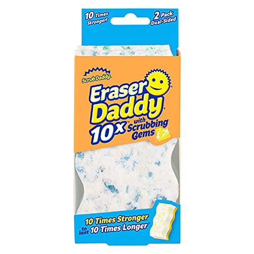 Eraser daddy 10x is a water-activated melamine eraser. It spot cleans marks and scuffs around your home just like a traditional eraser, without wearing like one! This dual-sided wonder features an exclusive tri-composite eraser material that lasts ten times longer than regular melamine. It's durable enough to be used time and time again. The backing and blend of flextexture add scrubbing power to help keep clean-up quick. Fed up with magic erasers that tear apart on your first use? Scrub Daddy is too! That's why they created their own. They made one that lasts 10x longer and is 10x stronger than any other. How? By designing a brand-new type of melamine that is packed with flextexture scrubbing gems. It's a new kind of magic eraser. Walls shouldn't tell more stories than the photos hanging on them. Thankfully, 10x makes it easy to undo the small signs of everyday wear like scuffs marks and even some not-so-small ones. Use 10x in areas residue tends to reside around the bathroom to reveal a brilliantly bright clean on tile, porcelain, glass and laminate.